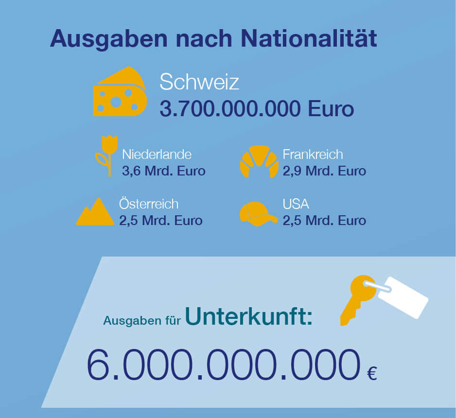Insgesamt hat Deutschland 38,4 Mio. Besucher aus dem Ausland. Auf den vorderen Plätzen liegen unsere Nachbarländer wie Holland (4,7 Mio.), Schweiz (3 Mio.), Großbritannien (2,6 Mio.) oder Österreich (2 Mio.). Doch auch Länder wie die USA sind gut vertreten (2,8 Mio.).