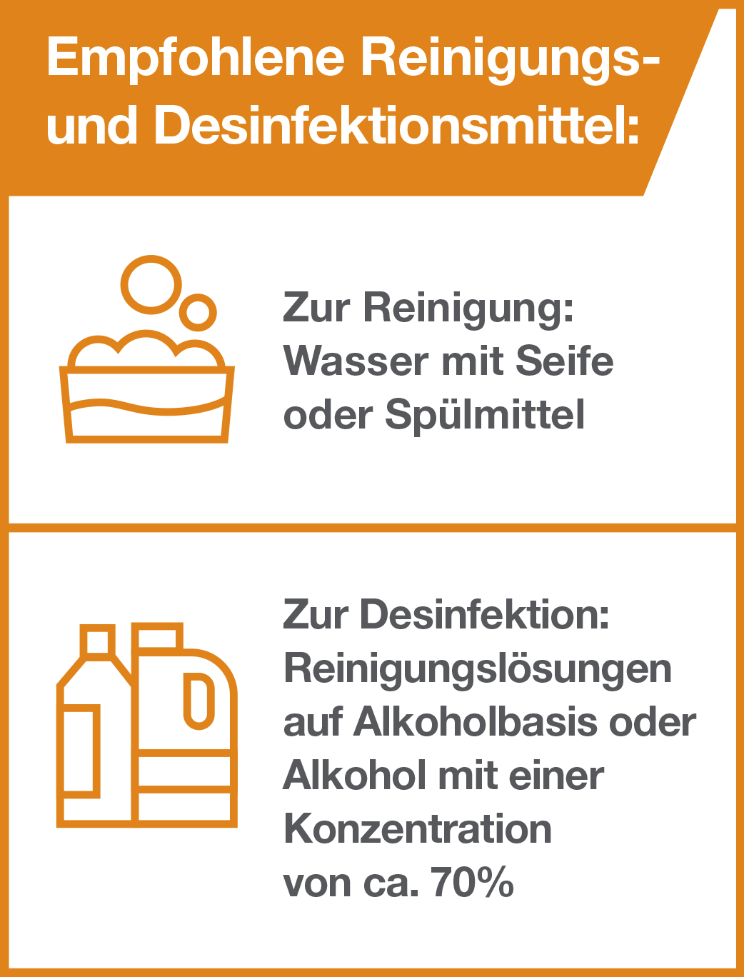 - Zur Desinfektion: Reinigungslösungen auf Alkoholbasis oder Alkohol mit einer Konzentration von ca. 70%