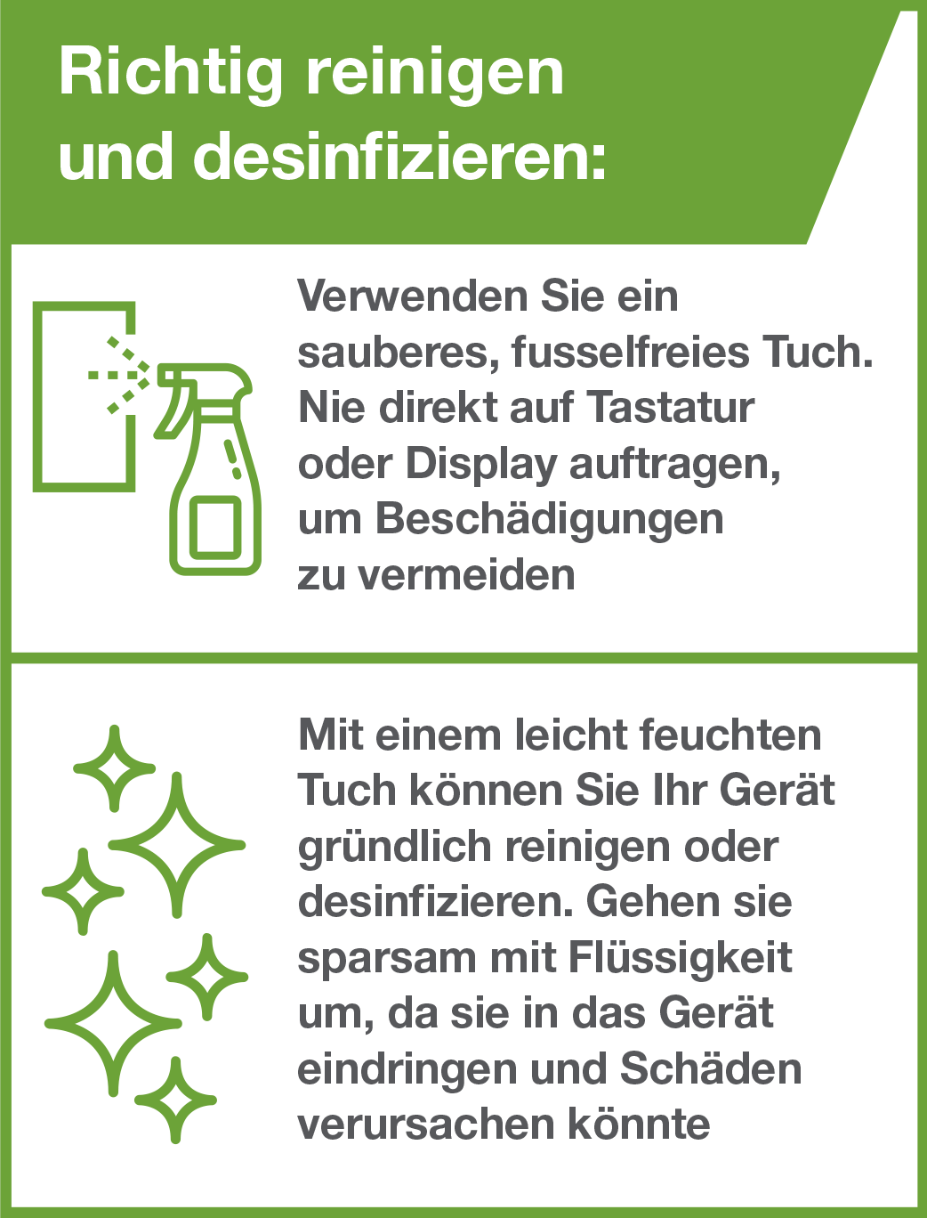 - Die Reinigungslösung nie direkt auf Tastatur oder Display auftragen – sie könnte das Gerät beschädigen