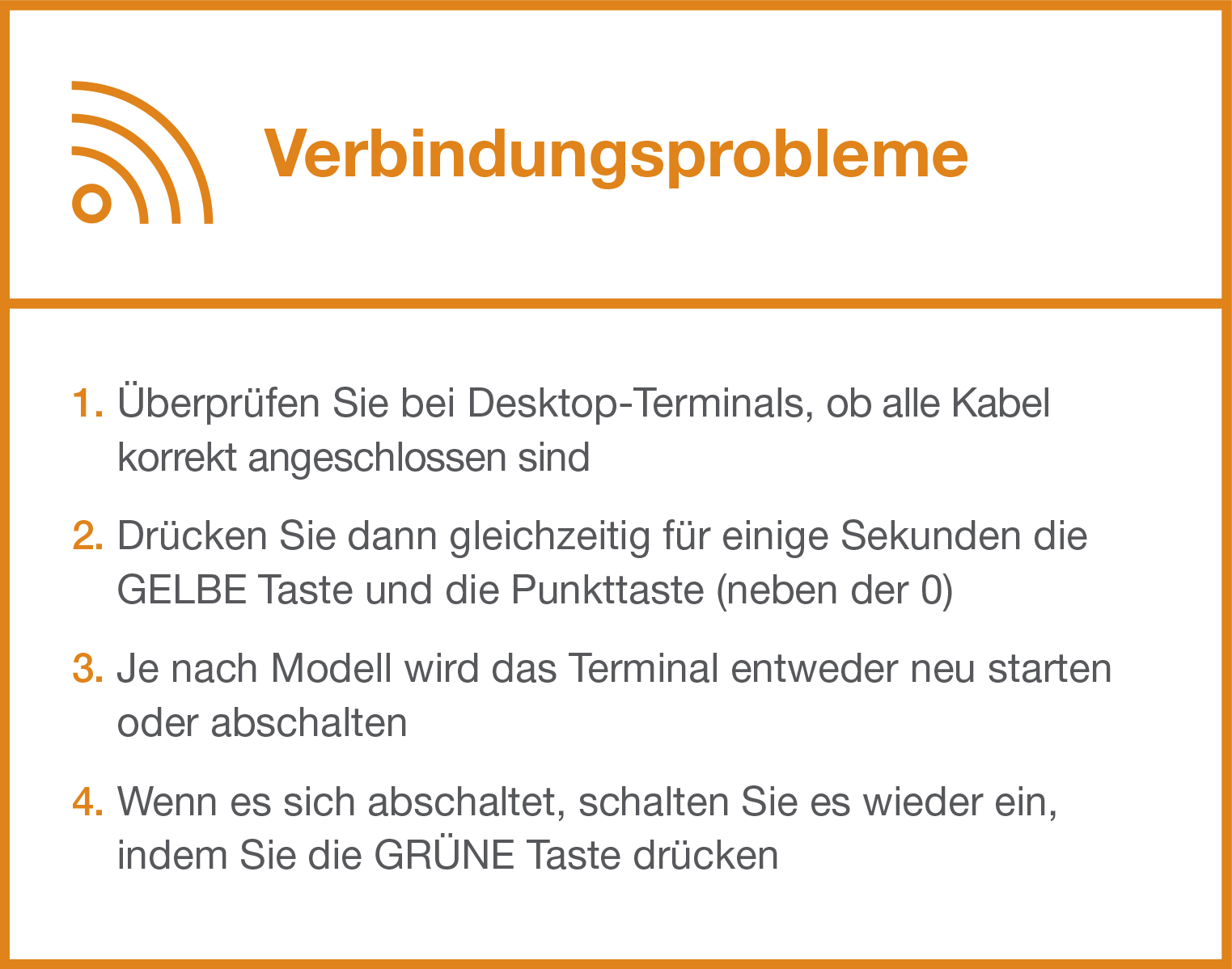 Bitten Sie Ihre Kunden, wo immer möglich kontaktlos zu bezahlen. Hierdurch wird der physische Kontakt mit dem Lesegerät auf ein Minimum reduziert. Trotzdem sollten Terminals regelmäßig und sorgfältig gereinigt werden.